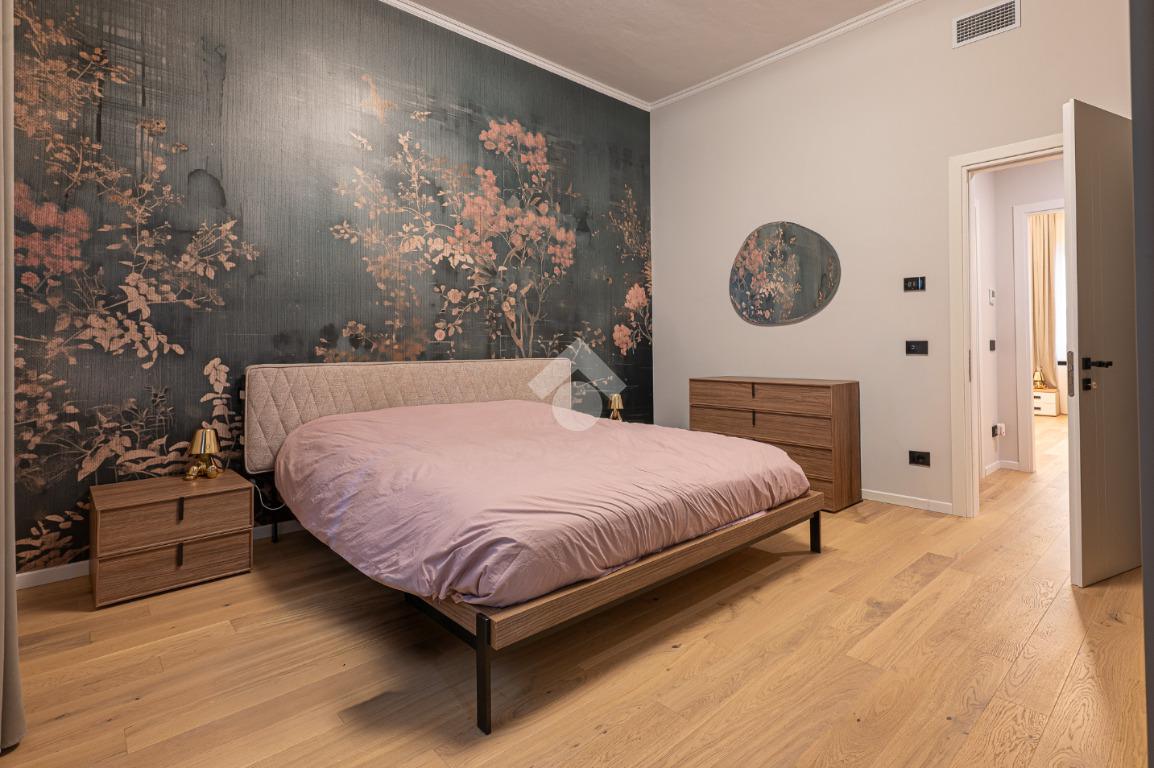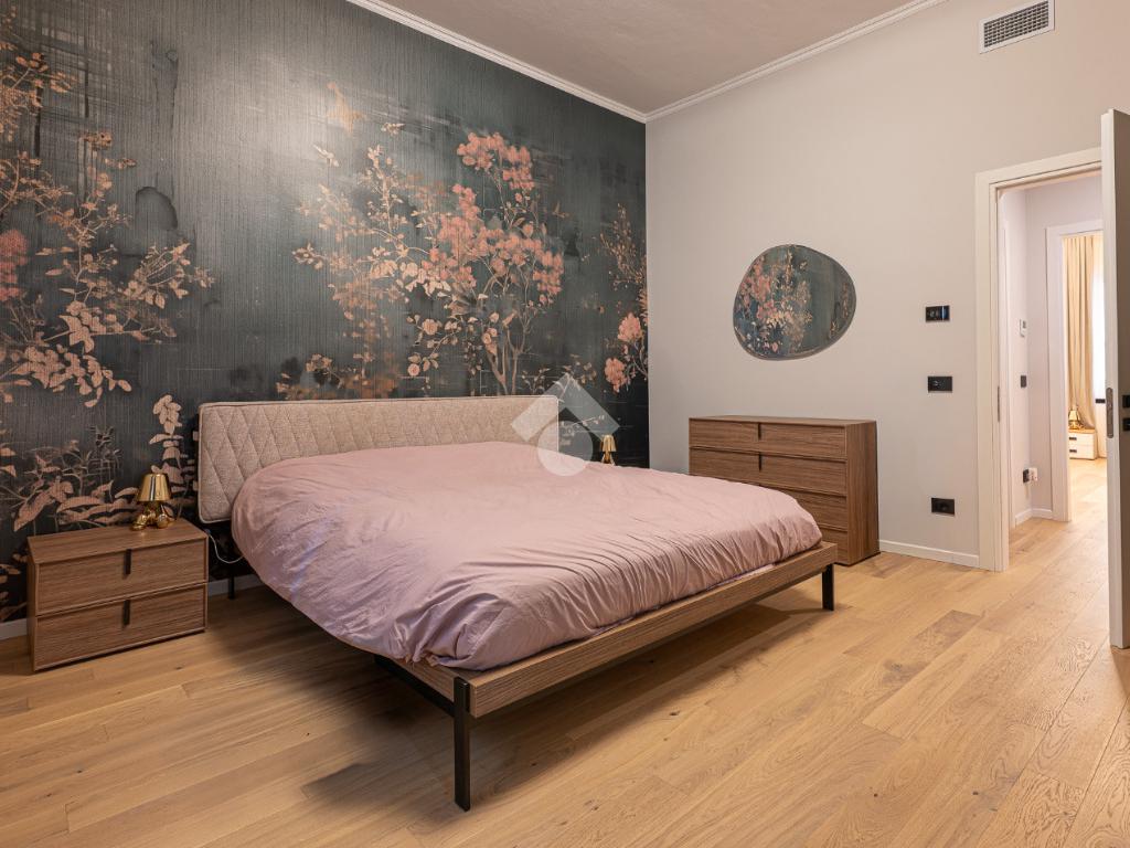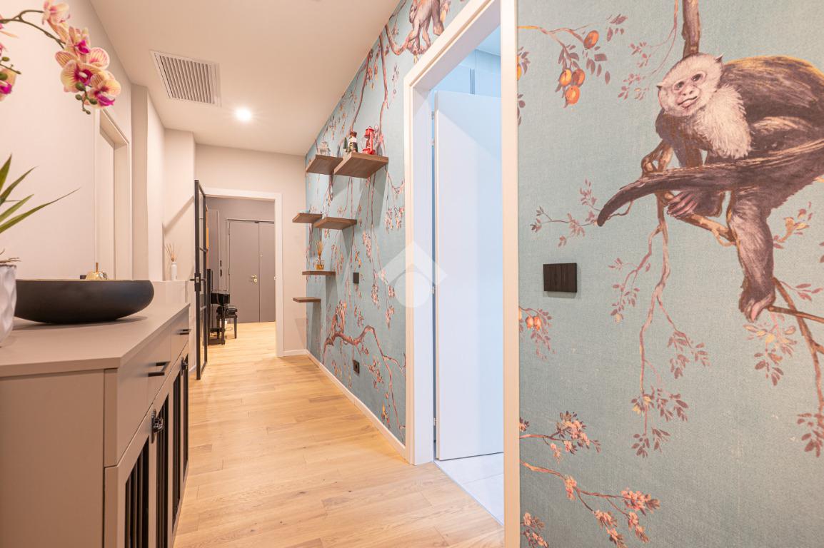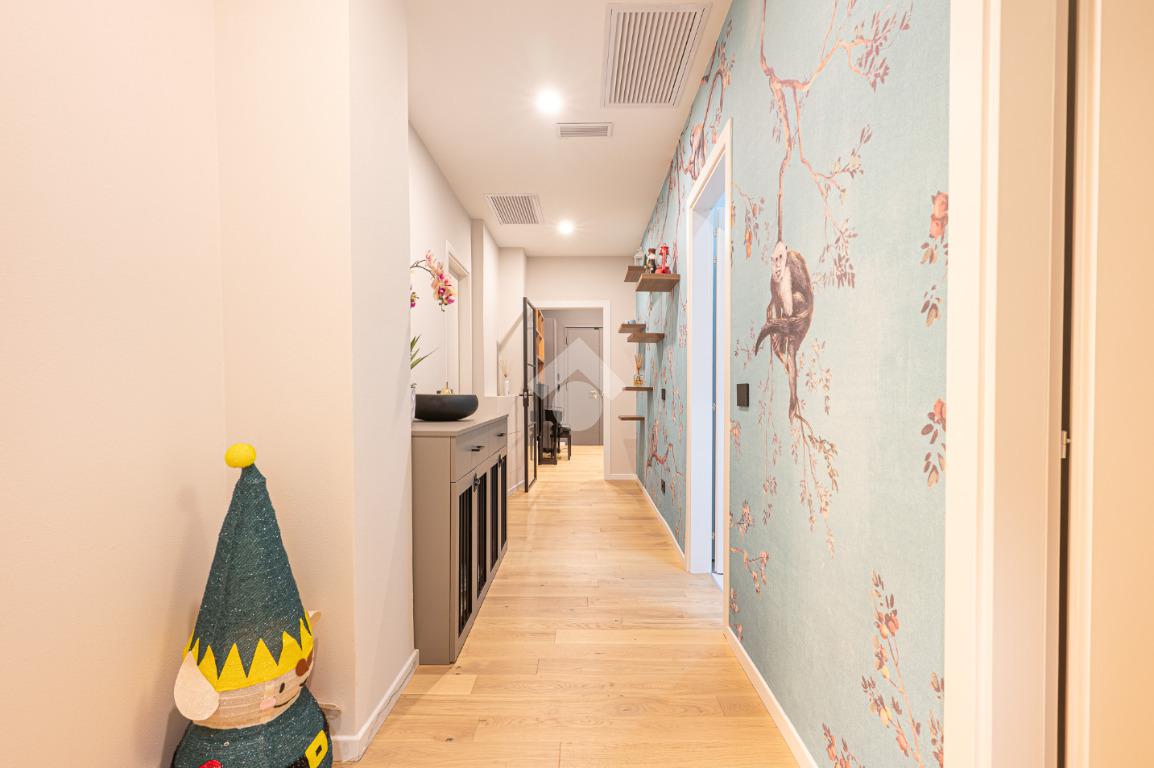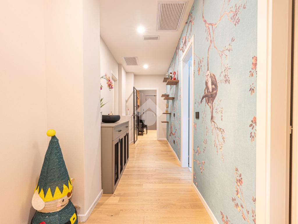 Il disimpegno centrale ci conduce alla zona notte composta da tre camere da letto matrimoniali, tra cui una lussuosa camera padronale con carta da parati botanica, armadiature su misura integrate e un servizio privato. La soluzione dispone di un bagno principale con lavabo sospeso, rubinetteria nera opaca a contrasto, ampia doccia con cristalli fumé e specchi retroilluminati.
