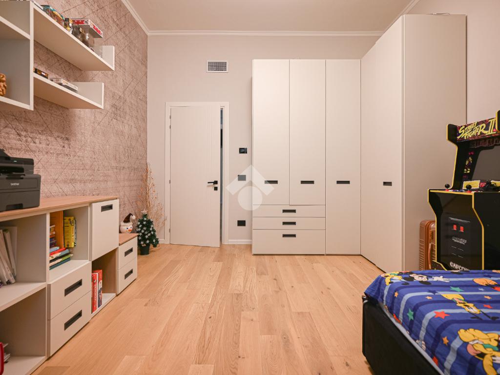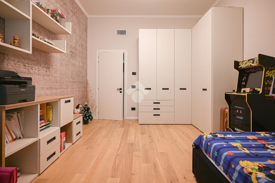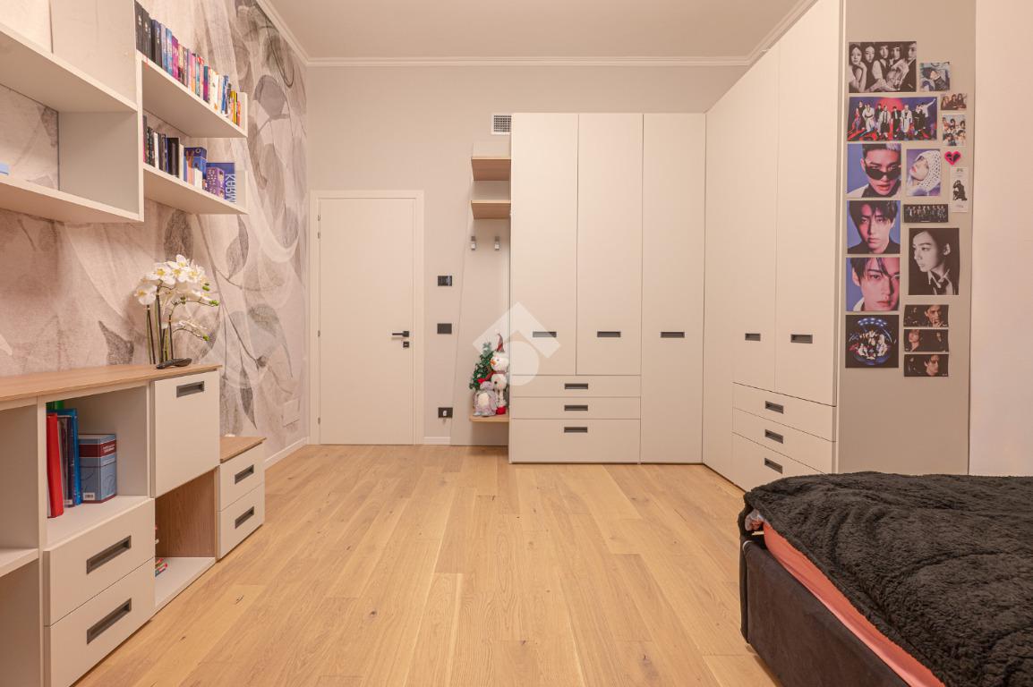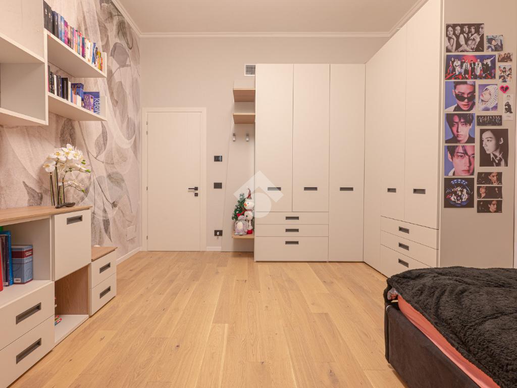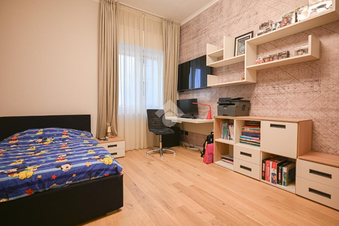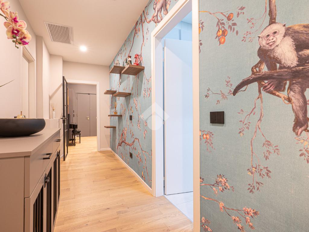 Il disimpegno centrale ci conduce alla zona notte composta da tre camere da letto matrimoniali, tra cui una lussuosa camera padronale con carta da parati botanica, armadiature su misura integrate e un servizio privato. La soluzione dispone di un bagno principale con lavabo sospeso, rubinetteria nera opaca a contrasto, ampia doccia con cristalli fumé e specchi retroilluminati.